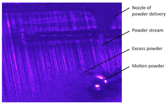 The individual subsystems were now merged to validate the potential of the SMD system for in-process joining technology. Firstly, the kinematics were mounted in a laser protection chamber. A rectangular frame made of aluminum profiles (Figure 8) was then built around the kinematics as an equipment carrier. The powder feed (Figure 9) and the shield gas feed (Figure 9) were each attached to this frame. A microscope camera was also attached for online observation of the process. The frame enables the vibration-sensitive powder feed and the kinematics or moving parts to be structurally separated. However, if vibrations caused by the other parts of the system lead to powder flow, future studies will be carried out to dampen the system. An aluminum profile was attached to the ceiling of the laser protection chamber to accommodate the optical isolator (Figure 3) of the laser and the two 90° mirrors (Figure 4) that deflect the laser beam towards the process action point. A focusing lens (Figure 4) was attached to the frame to focus the laser beam. A microscope camera with magnifying optics and a bandpass filter were installed for in situ observation of the process. The bandpass filter selectively permits the wavelength of UV light to pass through, rendering the melt pool visible (Figure 10). Table 2 summarizes the technical data of the experimental setup.