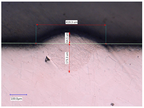 The samples were then cut perpendicular to the welding direction, ground, polished, and treated with V2A stain at 70 °C. The micrographs were viewed and measured using a Keyence VHX 5000 microscope (Figure 11).
