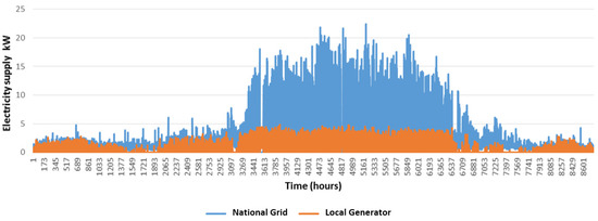 BG energy consumption for 8760 h in 2018. On-grid demand was supplied from the national grid (blue line), and energy consumption during outage hours (off-grid) was covered by a local generator (orange line).