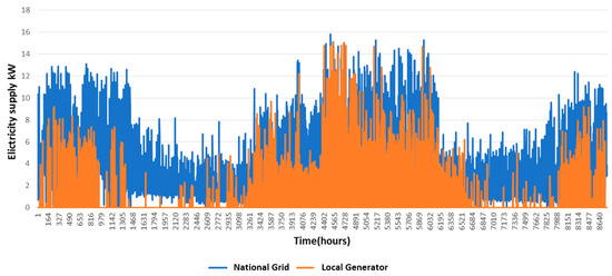 In Figure 2, we also note that hourly consumption from the generator remains relatively stable, hovering below 5 kWh, owing to the procurement of electricity from the local generator at a high cost. However, there is an evident uptick in electricity usage in Figure 3 when disconnected from the national grid, attributed to reliance on a large home generator (40 kWh) without limitations or restrictions, unlike the scenario depicted in Figure 2. This flexibility enables the system to meet high load demands effectively.