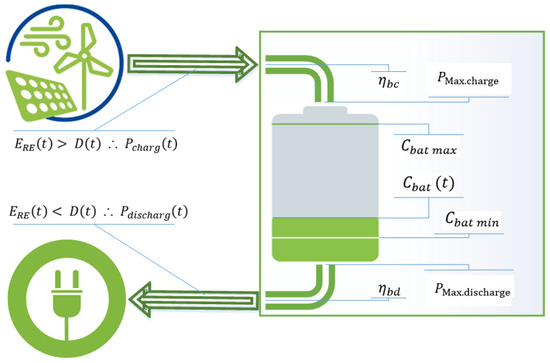 If Equation (4), the energy flow between renewables and battery must be estimated to determine the state of storage capacity, . The calculation depends on the state of storage capacity at a previous time step , such that the following applies: