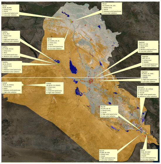 Amidst pressing global electricity demands and its shortfall in residential supply in many countries, we target solutions. Focusing on Iraq’s energy systems—thermal, photovoltaic (PV) panels, and wind— our study primarily examines the electricity generation potential of renewables. We center our efforts on PV panels and wind turbines, vital for Iraq’s energy crisis and renewable energy goals [1,2]. In regions facing extreme climatic conditions, such as Iraq, this energy crisis becomes even more pronounced [3,4]. Iraq serves as a pertinent case study, grappling with heightened energy requirements for both cooling during summers and heating throughout winters. Notably, a substantial energy demand–supply gap has persisted over the past decade (2010–2020) [5]. This disparity underscores the imperative for the integration of renewable energy resources, even within oil-rich nations. Against the backdrop of the prevailing energy crisis and escalating environmental degradation on a global scale, the expedited development of renewable energy sources like solar and wind is of paramount importance [6].