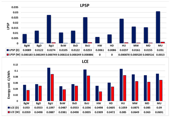 Predicted LPSP, LCE, PBP, and HRES size used to evaluate the performance of different optimal configurations that were determined for different land use covers (water, desert, and urban) for four locations in Iraq (Baghdad, Basra, Haditha, and Mosul) using KR demand and applying the 2D strategy. D.N, D.O, W.N, and W.O have been used. BgW: Baghdad Water, BgD: Baghdad Desert, BgU: Baghdad Urban, BsW, BsD and BsU: Basra locations, Water, Desert Urban areas. HW: Hadiata Water. HD: Haditha Desert. HU: Haditha Urban, MW: Mosul Water, MD: Mosul Desert. MU: Mosul Urban.