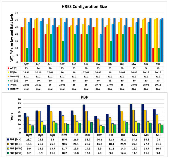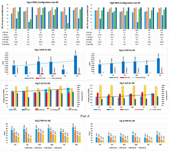 The impact of decreasing wind and solar energy from AD to MD is evident in the LPSP and LCE results. LPSP shows a linear gradient increase from AD to MD for both BG and KR demands (Figure 9C,D). Likewise, the LCE results exhibit the same trend, as seen in LCE (D) for both BG and KR demands (Figure 9E,F). These findings highlight the correlation between higher availability of wind and solar energy, leading to increased reliability (LPSP) and reduced energy costs (LCE), consequently resulting in shorter payback periods (PBP).