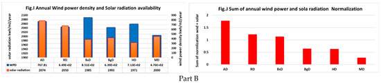 Results of LPSP, LCE, Saving, and the HRES Size in (Part A) and PBP in (Part B), to evaluate the performance of different optimal configurations that have been determined based on desert areas at Haditha HD, Amara AD, Basra BsD, Baghdad BgD, and Mosul MD using KR and BG demand and applying 2D strategy. D.N, D.O, W.N, and W.O have been used. (Annual Wind energy density and Solar radiation availability) and (Sum of annual wind energy and solar radiation normalization) in (Part B) shows the weight of solar and wind resource equally at each location to determine the availability of solar and wind energy.