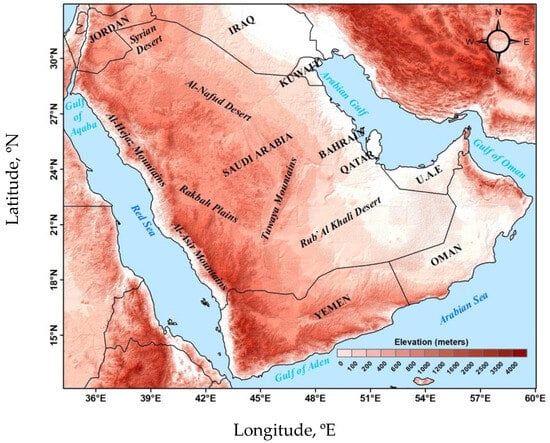 Table 1, Table 2 and Table 3 displays the geographical coordinates and average meteorological conditions in Saudi Arabia, the UAE, Qatar, Bahrain, Oman, Yemen, Iraq, and Jordan during 1985–2015. The existing climatological conditions, including low cloudiness and long daylight hours, provide a great advantage in using solar energy as an alternative to conventional fossil-fuel energy sources. Solar power plants are, however, relatively new in the study area. Frequent dust storms from vast deserts located in those countries make it difficult to maintain solar panels; they also reduce PV’s efficiency. Some countries, like Yemen and Jordan, have to rely on foreign investments to establish large solar power stations, with the KSA and the UAE among the key players in such investments [,,].