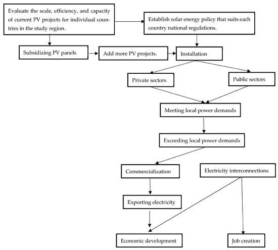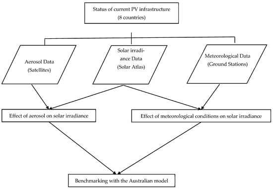The selected countries in this work are located within the Sun Belt region (40 °S to 40 °N) and are known for their arid/semiarid landscape and abundance of sunshine most of the year, which make them potential candidates for harvesting solar energy. However, a better understanding of the temporal and spatial characteristics of solar energy and better knowledge of the existing capacity of the current PV networks is important to optimizing the use of solar energy in this part of the world [,].