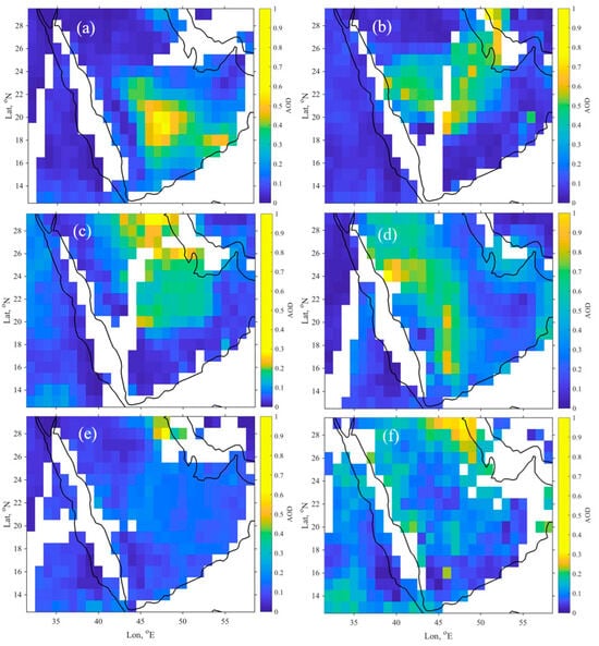 Dust and aerosol data were collected using the Moderate Resolution Imaging Spectroradiometer (MODIS) on the Giovanni NASA platform []. MODIS is a key sensor instrument aboard the Terra and Aqua satellites that collects data over the entire globe every 1–2 days. Since the beginning of the Terra satellite mission in 2000, MODIS has provided data on aerosol loading over land and water at 3 km resolution [,]. The aerosol optical depth (AOD) is a dimensionless optical parameter that can be retrieved by MODIS and designed to measure the extinction of the solar radiation by aerosols, haze, and dust.