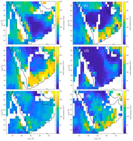 Further, Ref. [] discussed the solar-radiation atlas of Saudi Arabia. Based on the atlas, the direct normal solar irradiance in different areas of Saudi Arabia varies from 9000 W h/m2/day to 5000 W h/m2/day during the months of June–August and January–March, respectively. Subsequently, Ref. [] estimated the global and solar radiations on horizontal and tilted surfaces over Jeddah using different meteorological parameters (i.e., temperature (max and min), daylight hours, and cloud cover) for the period 1996–2007. An empirical relationship was then examined for diffuse solar radiation on horizontal surfaces, while the total solar radiation on tilted surfaces was estimated by using [] “isotropic” and [] “anisotropic” models and compared them with the results of the NASA “SSE model”. The findings highlight that these models are capable of estimating solar radiation on horizontal and tilted surfaces in Jeddah with a reasonable precision. A simple model was developed in [] to estimate the monthly average global solar radiation over Tabouk and compared the model output with those from 29 other regression models and with collected solar-radiation data. The results showed high precision for the region. The optimum tilt angle for PV solar panels was also estimated for the city of Najran in the southwestern region of Saudi Arabia [].
