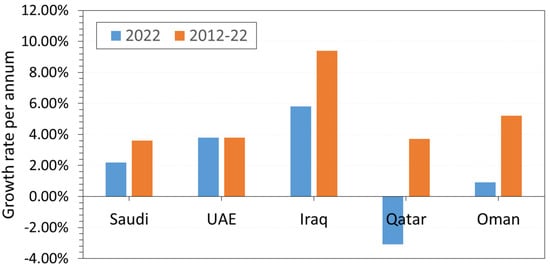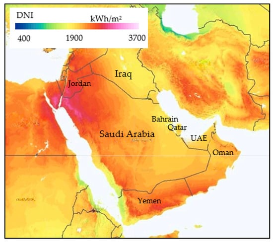 Despite their slower economic growth compared to GCC, Yemen, Iraq, and Jordan (Figure 1) have also high energy demands, and the majority of their energy consumption is in transportation and electricity generation []. Most of these countries are heavily dependent on fossil fuels to cover their energy needs. This high energy demands have created a surge in interest in diversifying their energy sources and exploring renewable energy as an additional source for power generation [].