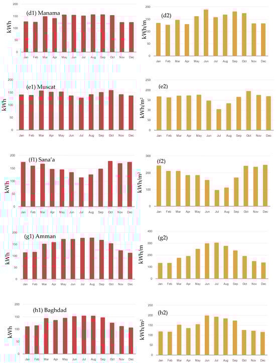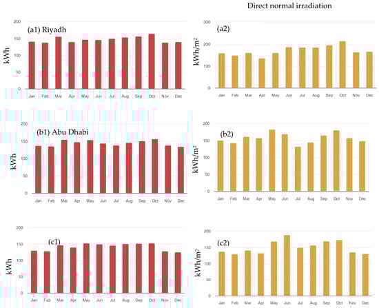 Several studies have been conducted to assess the solar potential over Jordan. The measured and simulated global and diffuse radiation over Jordan, along with various meteorological parameters, were compared in []. The results showed a good agreement between measured and simulated data. Consequently, this study also included the optimized angle of inclination for each month of the year to maximize energy production.