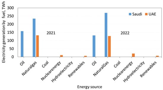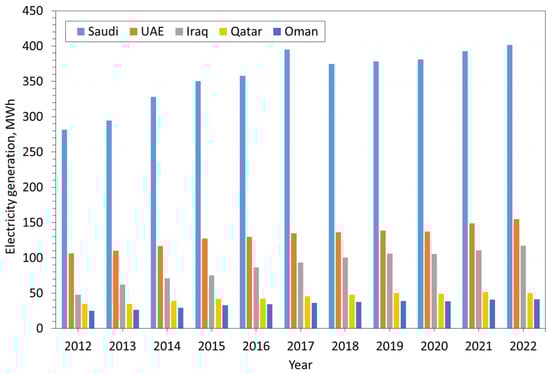 Rapid economic development and population growth in the oil-rich Gulf Cooperation Council (GCC) countries [,] (Saudi Arabia-KSA, United Arab Emirates-UAE, Qatar-QA, Bahrain-BH, Kuwait-KW, and Oman-OM) (Figure 1) have significantly increased energy demands over the last few decades. The GCC countries consume approximately 20% of the world’s oil production and are among the major consumers of natural gas [,]. Moreover, air conditioning and water-desalination plants add to the energy demands in GCC [,].