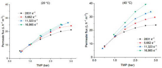 Two temperatures were tested, 20 °C and 40 °C, with the 5 kDa PES membrane. Four shear rates were applied, 2831, 5562, 11,323, 16,985 s−1, corresponding to the feed flowrates of 50, 100, 200, 300 L h−1, respectively. For both temperatures, the permeate flux increased with the transmembrane pressure (TMP), almost linearly for the highest shear rate and with a curve form from 1.0 bar, the limit pressure, for the lowest shear rate (Figure 2). Until 1.0 bar, the fluxes were similar for all shear rates at both temperatures. When the TMP increased, shear rate influence increased, and it was more obvious at 40 °C. The highest flux was from 21 to 27 L h−1 m−2 at 20 °C and from 24 to more than 39 L h−1 m−2 at 40 °C, according to the shear rate.