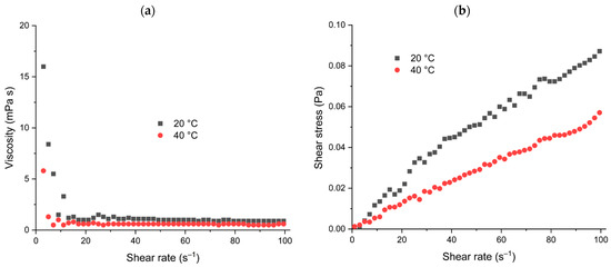 (a) Influence of temperature (20 °C and 40 °C) on SCB extract viscosity at different shear rates and (b) relationship between shear stress and shear rate.