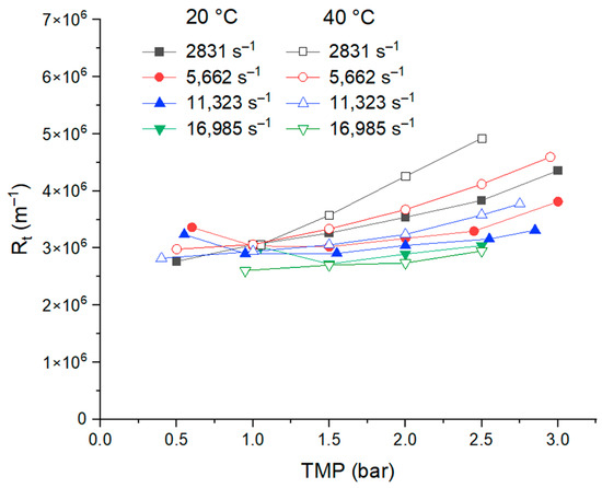 Total hydraulic resistance (RS) as a function of TMP, at 20 °C and 40 °C, with different shear rates.