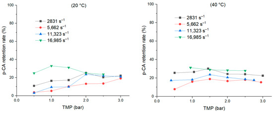 Influence of temperature on the p-coumaric acid (p-CA) retention rates of the PES 5 kDa membrane at different TMP and shear rates.