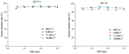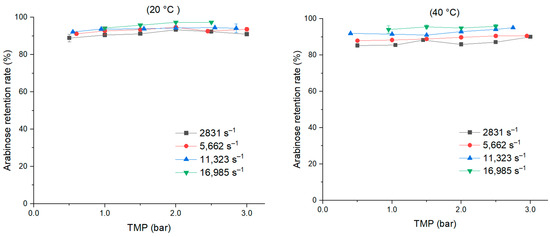 The retention rate of xylose ranged from 80% to 91% at 20 °C, and from 73% to 91% at 40 °C, depending on the shear rate (Figure 7), while the arabinose retention rate ranged from 85.2 to 95% (Figure 8). The retention rate of these two sugars were not impacted by the TMP for both temperatures, but the influence of shear rate was more obvious at 40 °C.