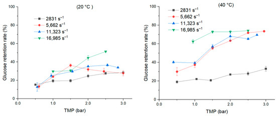 In the case of glucose, the increase in TMP led to an increase in glucose retention rate, varying from 13 to 51% at 20 °C and from 21 to 42% at 40 °C. At the shear rate of 2831 s−1, the glucose retention rate was almost the same, ranging from 13 to 28% at 20 °C and from 19 to 35% at 40 °C. However, at higher shear rates and a TMP ranging from 1.0 to 3.0 bar, the retention rate of glucose at 40 °C was much higher than that at 20 °C. For example, at TMP 2.5, from low to high shear rate, the retention rate was 28, 30, 37, and 51% at 20 °C, and it was 28, 71, 65, and 74% at 40 °C (Figure 9).