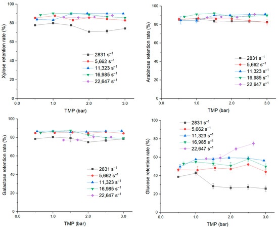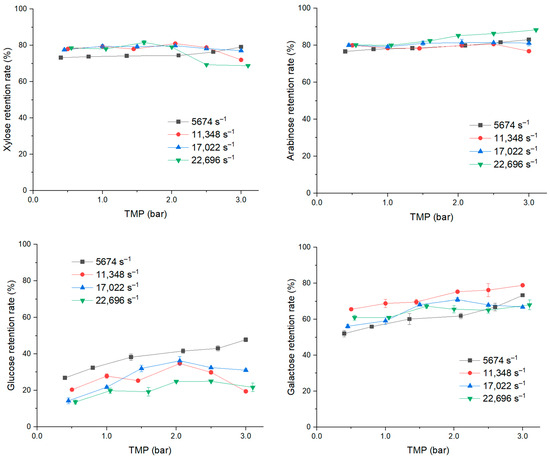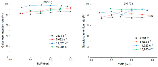 As shown in Figure 10, the TMP did not impact the retention rate of galactose for both temperatures. At 0.5 bar, the increase in shear rate from 2831 to 5662 s−1 did improve the retention rate, which stood at 81 and 77% at 20 °C and 40 °C, respectively. With the shear rates of 2831, 5662, and 11,323 s−1, the lower temperature could retain more galactose, especially with the shear rate of 11,323 s−1, but not in the case of the shear rate 16,985 s−1.