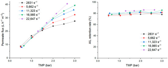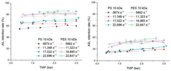 The PS membrane presented a retention rate for AIL and ASL, respectively, that were about 60% and 20% lower than the PES membrane which, respectively, exhibited rates of 80% and 30% (Figure 15). The retention rate of both AIL and ASL for the two membranes slightly increased when the TMP increased. For AIL, there was a greater impact of shear rate on the retention rate of the PS membrane than for the PES membrane. For example, with the PS membrane, the shear rate of 5674 s−1 afforded a much lower AIL retention rate compared to other shear rates.