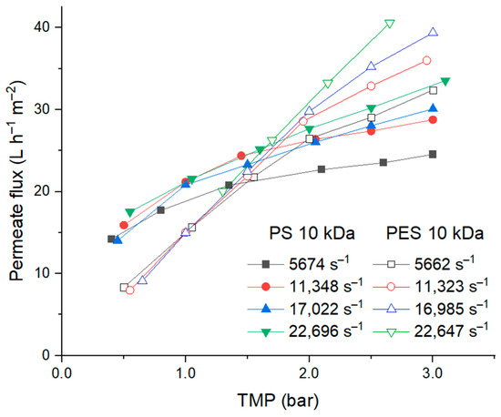 Permeate flux for the PS and PES 10 kDa membranes at different TMP and shear rates.