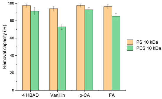 Removal capacity for phenolic acids via the PS and PES 10 kDa membranes.