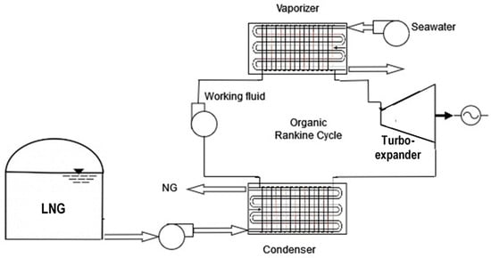 The literature shows that LNG flow rates in the range of 3600–5325 kg/h could be available in GSs, and, theoretically, a cooling power of 1 MW can be regained []. Therefore, the recovery of part of this cooling power for the supply of some ship’s needs is highly attractive. For instance, a highly energy-intensive sector such as the cruise segment could be involved, considering the required onboard services such as sub-zero refrigeration (for food conservation), freshwater production and air conditioning. The recovery of part of LNG exergy potential can be endorsed by using organic Rankine cycles (ORCs) in which the condensation of the working fluids allows for the release of heat to the LNG that, in this way, vaporizes avoiding discharge seawater at low temperatures. On the vaporizer side, instead, heat is absorbed from other fluids, reducing temperatures and making them suitable as cold energy carriers for other applications. Finally, a turbo-expander located between the vaporizer and the condenser allows for the production of mechanical work to convert into electric power, avoiding fuel combustion.