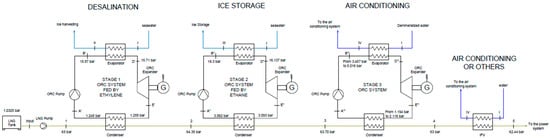 In the proposed plant, ORC vaporizers are supplied by independent seawater flow rates (heat sources), each dedicated to the production of ice and chilled water to employ for freshwater, sub-zero refrigeration and air conditioning. In particular, seawater is the hot fluid for the first and second ORC, whereas, for air conditioning purposes, demineralized water is considered. As design parameters, an outlet seawater temperature for freshwater production of 246.15 K was set, whereas sub-zero refrigeration requires a seawater outlet temperature of 268.15 K (−5 °C) and demineralized water at 278.15 K (+5 °C) to promote air dehumidification in the AHU cooling coils.