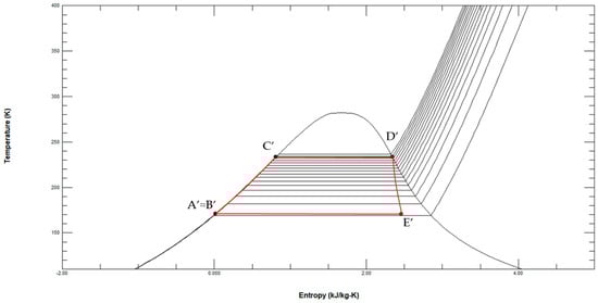 It is worth noting that, for the ice formation, the sensible heat required to pre-cool the water flow rate from the initial value (TinR) down to the freezing temperature (TfreezR), as well as the sensible share required to bring the ice down to the final temperature (ToutR), is considered. Moreover, specific heats of 4187 J/kgK and 2051 J/kgK were set for the water and the ice, respectively, left constant in light of the limited temperature differences. For the analysis of the real points in the cryogenic cycles, a pinch point (the minimum temperature difference between the hot and the cold streams) of 10 °C between the fluids was imposed.