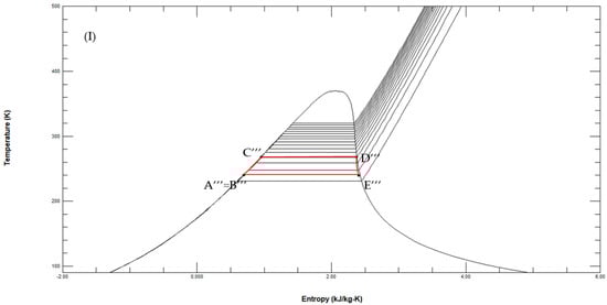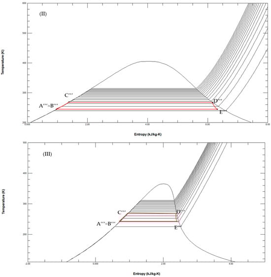 According to the scheme depicted in Figure 3, the proposed system can differ only for the third ORC, for which R290, R717 and R1270 can be employed. It has to be noted that the water temperature in the evaporators represents an upper limit that, considering the imposed pinch point temperatures difference, does not allow for the value to exceed 0 °C, due to the third stage operating with a working fluid that cannot go over a temperature of −5 °C. Practically, this limits the temperature difference between the evaporation and condensation phases, which impacts the ORC’s thermal performance.