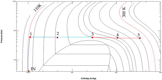 Assuming the sailing mode, the electrical power required from an existing cruise GS [] is about 50 MW, produced by dual-fuel hybrid engines. Consequently, an LNG flow rate of 1.25 kg/s (108 tons of LNG per day) determined by Equation (1) can be used as the cold flow rate crossing the condensers. The LNG inlet pressure in the first condenser was set to 65 bar, a value greater than the critical point (about 45 bar), to involve only sensible heat during the regasification process and to limit the pumping work due to the compression in the liquid phase. LNG is treated as pure methane, with a percentage fraction often closer to 98% at an initial temperature of 113.25 K (−160 °C).