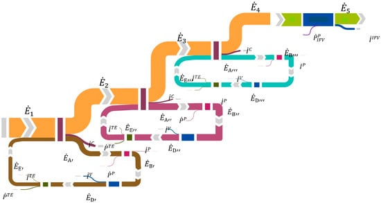From an environmental viewpoint, the ORCs’ effects are taken into account by an environmental impact index (EI) calculated by combining the exergy defect, global warming potential (GWP) and the measure of some risk aspects concerning the working fluids on board []. The choice to use the exergy defect concept to determine the environmental impact is due to the irreversibilities connected with the ORC components, because the higher the irreversibilities in the system, the higher the modification of the external environment []. The exergy defect is calculated starting from the achievable maximum mechanical work derived from the general equation of exergy, which in steady-state conditions can be written as follows: