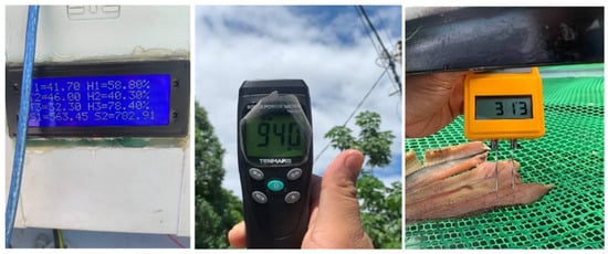 Data recorded using the sensor (left), solar radiation measured using a hand-held solar meter (middle), and fish moisture measured using a portable meat moisture meter (right).
