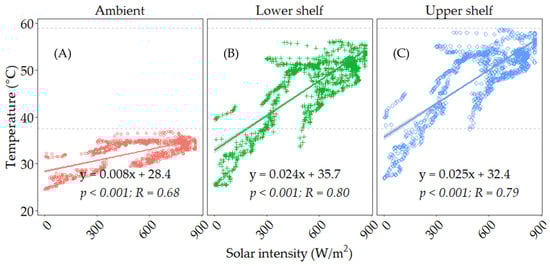A simple linear regression was applied to detect the variation of temperatures measured inside and outside the drying chamber using the sensor with respect to different levels of solar radiation recorded during the daytime [33,34]. Assumptions of normality, linearity, homoscedasticity, and independence were checked, but because there were thousands of data for each parameter due to 24 h recordings documenting every minute for three weeks, the assumptions were met [35]. The result was presented on a scatterplot with a line of best fit, while its equation, P-value, and correlation coefficient (R) were shown on that graph only when significance was detected between the dependent and independent variables. R is used in a simple linear regression rather than the coefficient of determination (R2) because it can show the sign of the relationship, either positive or negative.