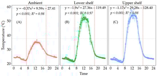 In addition to the determination of the solar radiation effect on temperatures, the relationship between the ambient, lower-shelf, and upper-shelf temperatures and time within the pre-determined period was also detected and was very highly significant (p < 0.001, R2 = 0.98; p < 0.001, R2 = 0.97; and p < 0.001, R2 = 0.98, respectively) (Figure 7). In all cases, the relationship had a concave shape and, according to the graph, the highest temperatures were observed between 11:00 and 13:00, during which the temperatures were 36.8, 56.2, and 58.7 °C for the ambient, lower shelf, and upper shelf, respectively.