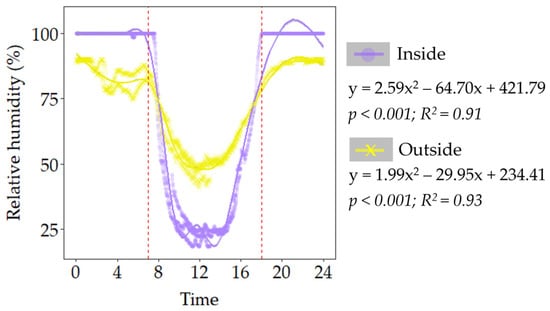 A second-order polynomial regression [36] was performed to detect how solar radiation, temperatures, and relative humidity in both drying methods varied in time. This method is commonly used with only one independent variable [37]. Then, results were presented using a scatterplot with curve lines, and if significance between dependent and independent variables was detected, the equation, P-value, and the coefficient of determination (R2) were shown on those graphs for prediction. In this model, R2 is used rather than R because the relationship can be both positive and negative due to a quadratic shape [38]. All these quadratic equations are applicable with the time from 07:00 to 18:00.