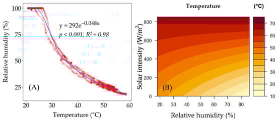 Temperature inversely affected relative humidity, and the shape was a descending exponential graph (p < 0.001, R2 = 0.98; Figure 9A). Relative humidity dropped from about 90% at a temperature of 30 °C to 23% at an average temperature of nearly 60 °C. Using the function, an increase of one degree Celsius in temperature may lead to a 4% decrease in relative humidity inside the solar dryer.