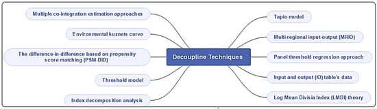 Another decoupling pointer was developed by Zhang and Wang [57] using the LMDI method to analyze the electricity consumption decoupling from China’s EG. In the environmental literature, the Kaya identity and the decoupling index were proposed by Tapio [33], and the LMDI was proposed by Ang [56]. These identified indexes analyze the decoupling energy consumption trajectory per capita and year of household income. The Tapio decoupling index and the LMDI decomposition approach shown in Figure 3 are employed to study the relationship between EG and CO2 emissions and decompose total CO2 emissions into predetermined factors to determine the Kaya identity. The rapidly changing climate pattern across the globe is considered a result of environmental changes caused by China [58]. Siping et al. [59] studied the decoupling of economic output and pollutant discharge fees for China’s Yunnan province by applying the Tapio decoupling elasticity.