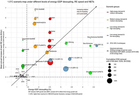 The 1.5 °C scenario map under different levels of energy—GDP decoupling, RE speed, and NETs [89].