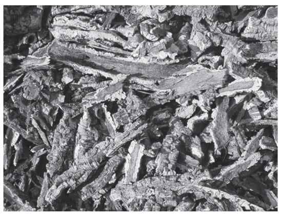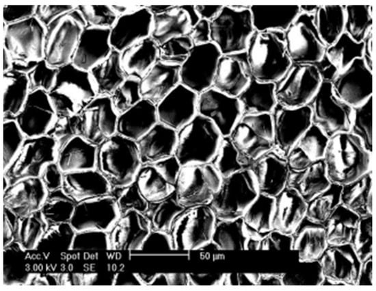 Its division consists of 45% suberin, this being a synthetic wax processed by the tree, and 27% lignin, an amorphous macromolecule found in various plants. The remaining 28% is composed of cellulose, other waxes and polysaccharides, tannins, and ceroids. The suberin guarantees the material’s waterproof and protective properties, while the lignin confers rigidity and resistance to several types of attacks, including microbiological and mechanical. Its closed cell structure is shown in Figure 1 [6].