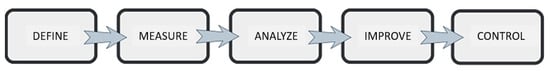 DMAIC (Define, Measure, Analyze, Improve, Control) is an acronym for the five phases of the cycle. This is a methodology largely applied in the lean philosophy and has the potential to be properly applied to the study in this paper. It allows the understanding of a process in a detailed and precise way, enabling the problem in question to be clearly clarified and the relationships between parameters to be found [12]. It also allows the process to be improved with a subsequent control system to prevent the same problem from occurring. As such, the parameters related to cork block production can be optimized following this methodology. The result of its application is highlighted, as a rule, in the improvement of the process. This methodology is represented in Figure 3.