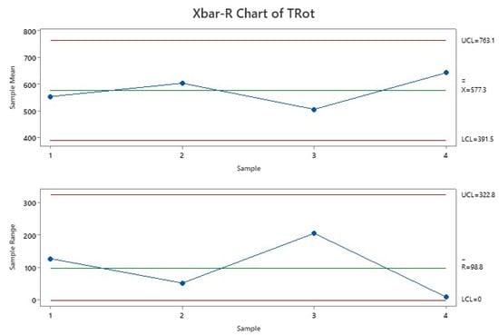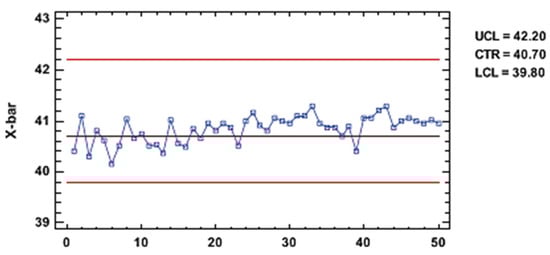 Graphically, this type of chart, where the red lines represent the UCL, LCL, and CTR lines, while the blue dots are plotted with the gathered data, is visualized as the example present in Figure 5 and Figure 6 [34]: