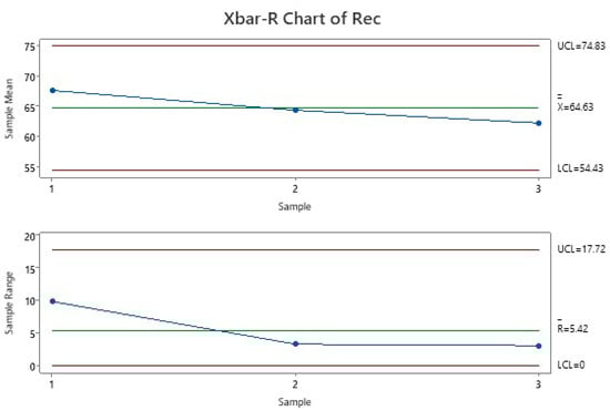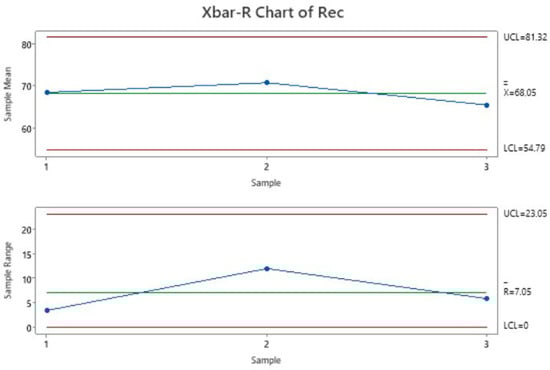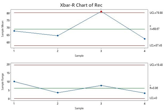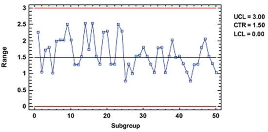 Identically to Product B’s out-of-control point, it was not possible to identify the cause of the variation, so this point must be removed, and a new analysis must be carried out. In this analysis, it is verified that after removing the out-of-control point, the other values are now in accordance with the limits stipulated by the mean and range chart, as shown in Figure 18.