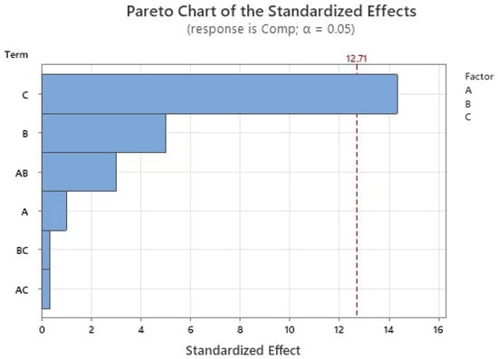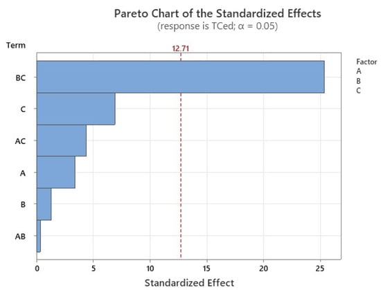 Interesting conclusions could be drawn for products B and D. To begin with, it was in the same mechanical characteristics, Compressibility and Tensile Strength, where these results appeared, which suggests that these outputs are the ones that present the greatest sensitivity to variations in parameters related to high-frequency baking. In Product B, it was the interaction between factors B and C that stood out, while in Product D, it was factor C. As such, the conclusion can be drawn that the stabilization time (factor C) should not be altered for either, while in Product B, the heating time (factor B) should also be maintained. Product D can change the current intensity (factor A) and heating time (factor B). For Product B, on the other hand, only changes in current intensity (factor A) are recommended.