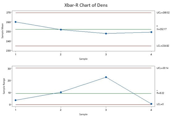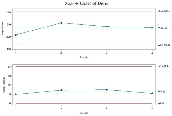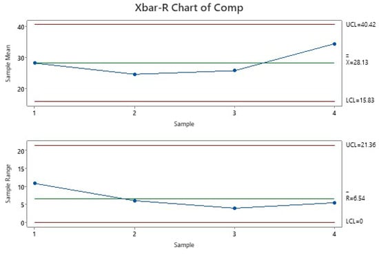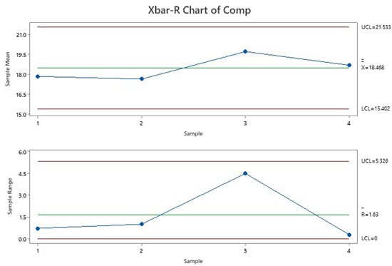 No person involved in the production of this block, such as the operator or supervisor, can identify the origin of the variation, which may be due to the quality of the raw material itself, or even to circumstances in the process, such as excessive time spent in some operation prior to heating, causing the mixture to overheat in those same operations of the agglomeration line, such as in the press or in the mixer itself. This is something that can happen due to a variety of circumstances that could not be controlled by the operator. Therefore, this point is removed, as it was a one-time event. With this, the control chart is now perfectly within the set limits, as shown in Figure 13.