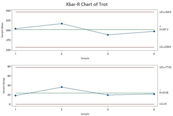 In this context, two types of charts arise: charts for large samples (n equal to or greater than 25) and small samples (n less than 25). For the first type, X and S charts, referring to mean and standard deviation, should be used. For the second type, X and R charts, referring to mean and range, are recommended [33]. In all control charts based on the mean, the central limit theorem can be applied, allowing us to assume that the variable studied has a normal distribution [33]. For sample sizes with less than 10 units, the most appropriate types are the X and R charts, and so it is necessary to first proceed to calculate the average amplitude, [33]:
