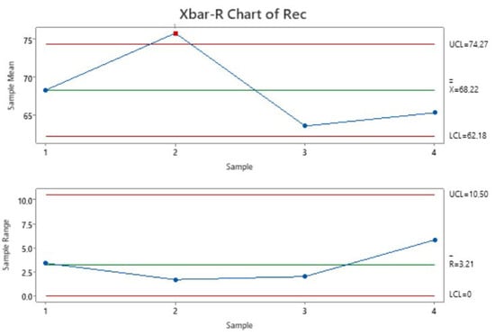 In the Recovery of this product, it is possible to observe that one agglomerated block, from which the two sheets result, presents a point above the upper control limit, as shown in Figure 12.