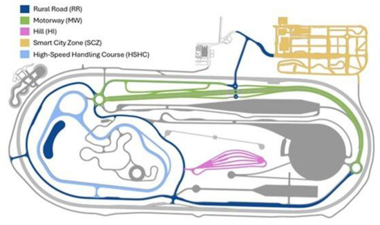 As of the test method, the same driving cycle was run for both vehicles in the ZalaZONE Proving Ground (www.zalazone.hu, accessed on 5 July 2024) on five different tracks (Figure 1), where the complete cycle consisted of 66 sub-sections.