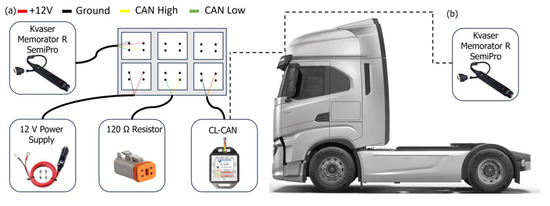 The complete test cycle was diversified from an environmental point of view, with a primary focus on simulating motorway mode and rural road transportation, supplemented by hill, slopes and urban environment. The data required for the measurements is derived from data available via the controller area network (CAN) system of the vehicles, with real-time readout and post-processing. The fleet management system (FMS) gateway provided a connection point to extract CAN data with a bus speed of 250 kbit/sec, which is a standard access point and bus speed. The decoding of the data is derived from the FMS standardised uniform system, with filtering the consumption specifically and influencing values. The data previously were read and processed by a CAN-based telemetry system (Figure 2) for test purposes, which included the following elements: a Kvaser Memorator R SemiPro CAN USB (Universal Serial Bus) interface (Mölndal, Sweden), a Terminating Resistor 120 Ω (Palmdale, CA, USA), a CL-CAN contactless CAN-data sensor (Budapest, Hungary) and a 12 V power supply.