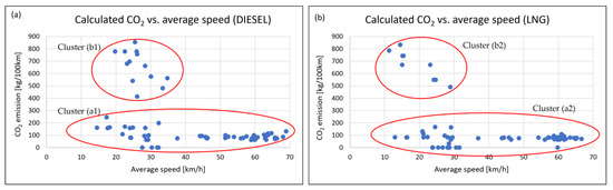The results are shown in Figure 3, in the form of a scatter plot, including all the data plots. As shown in (Figure 3), two subgroups of data can be clearly separated in the range of results for both vehicles. One of the separated data groups illustrates the tests performed under high load (on the upslopes track module), while the other points illustrate the data recorded in normal operation at urban, highway and motorway track modules. Therefore, in order to evaluate the results, the whole data set is separated, segmented into two types of data and analysed separately. Therefore, these Figure 3 charts are separated into the usual run measurements (see Cluster (a1) and Cluster (a2) data points) and special high load measurements (see Cluster (b1) and Cluster (b2) data points).